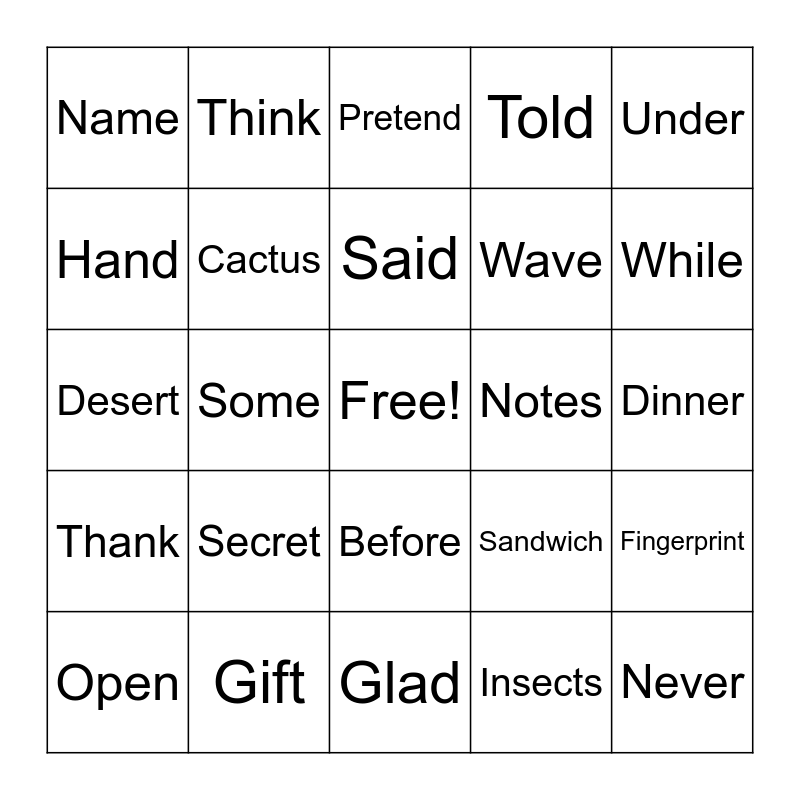 This bingo card has a free space and 24 words: Secret, Gift, Said, Open, Under, Name, Hand, Think, Notes, Before, Wave, Desert, Sandwich, Fingerprint, Cactus, Insects, Dinner, Pretend, While, Some, Never, Thank, Told and Glad.
