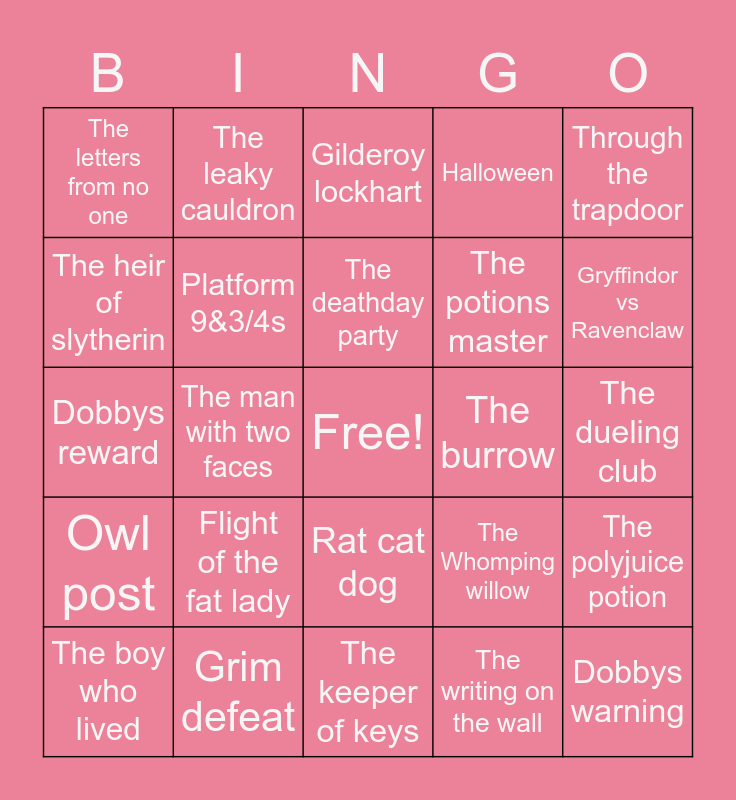 This bingo card has a free space and 55 words: The philosophers Stone, The boy who lived, The vanishing glass, The letters from no one, The keeper of keys, Diagon alley, Platform 9&3/4s, The sorting hat, The potions master, The midnight duel, Halloween, Quidditch, The mirror of erised, Nicholas Flamel, Norbert the Norwegian ridgeback, The forbidden forest, Through the trapdoor, The man with two faces, The worst birthday, Dobbys warning, The burrow, At flourish and blotts, The Whomping willow, Gilderoy lockhart, Mudbloods and murmurs, The deathday party, The writing on the wall, The rouge bludger, The dueling club, The polyjuice potion, The very secret diary, Cornelius Fudge, Aragog, The chamber of secrets, The heir of slytherin, Dobbys reward, The prisoner of Azkaban, Owl post, Aunt Marge Big mistake, The Knight bus, The leaky cauldron, The dementor, Talons and tea leaves, The boggart in the wardrobe, Flight of the fat lady, Grim defeat, The marauders map, The Firebolt, The patronus, Gryffindor vs Ravenclaw, Snapes Grudge, The quiddich final, Professor Trelawneys prediction, Rat cat dog and Moony wormtail Padfoot and prongs.
