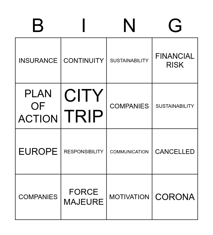 ⚠ This card has duplicate items: DUBLIN (2), CANCELLED (2), CORONA (2), COMPANIES (2), EXPENSIVE (2), FINANCIAL RISK (2), CITY TRIP (2), SUBSIDY (2), SUSTAINABILITY (2), RESPONSIBILITY (2), COMMUNICATION (2), PLAN OF ACTION (2), EUROPE (2), MOTIVATION (2), INSURANCE (2), FORCE MAJEURE (2)
