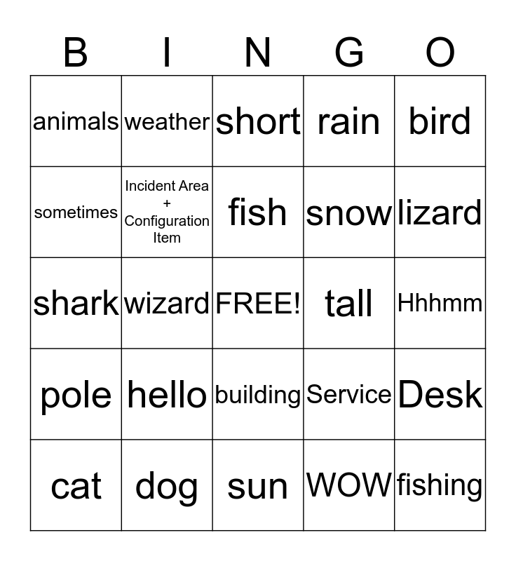 This bingo card has a free space and 24 words: hello, dog, fish, cat, bird, animals, sometimes, weather, tall, building, snow, shark, Service, Desk, Incident Area + Configuration Item, WOW, Hhhmm, short, lizard, wizard, fishing, pole, rain and sun.