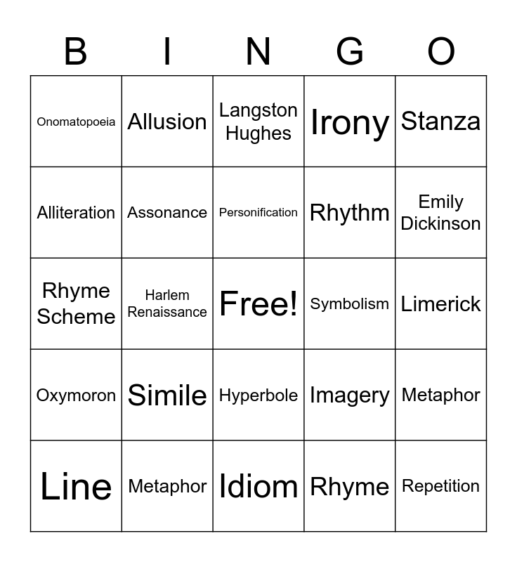 This bingo card has a free space and 24 words: Simile, Metaphor, Personification, Line, Stanza, Onomatopoeia, Alliteration, Allusion, Symbolism, Hyperbole, Rhythm, Rhyme Scheme, Imagery, Metaphor, Assonance, Rhyme, Limerick, Langston Hughes, Emily Dickinson, Harlem Renaissance, Repetition, Oxymoron, Irony and Idiom.