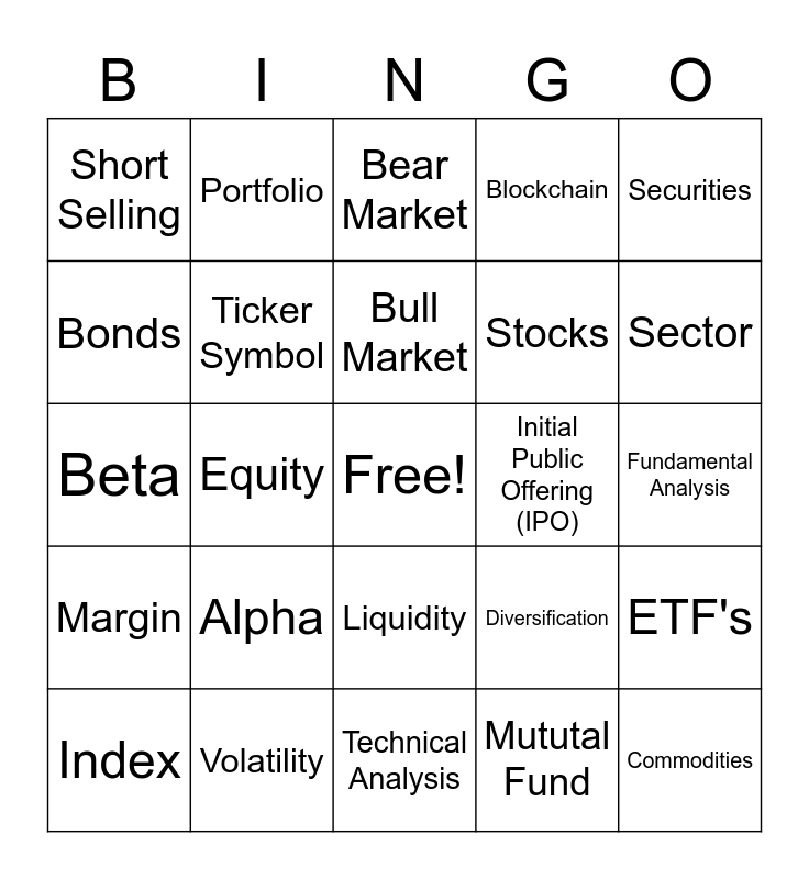 This bingo card has a free space and 33 words: Capital Gains, Dividends, Equity, Discount Brokerage, Margin, Ticker Symbol, Securities, Index, Portfolio, Dividend Yield, Bull Market, Bear Market, Options, Futures, Initial Public Offering (IPO), Sector, Volatility, Beta, Alpha, Diversification, Liquidity, Long Position, Short Selling, Fundamental Analysis, Technical Analysis, Commodities, Blockchain, Stocks, Bonds, ETF's, REIT's, Mututal Fund and Cryptocurrencies.