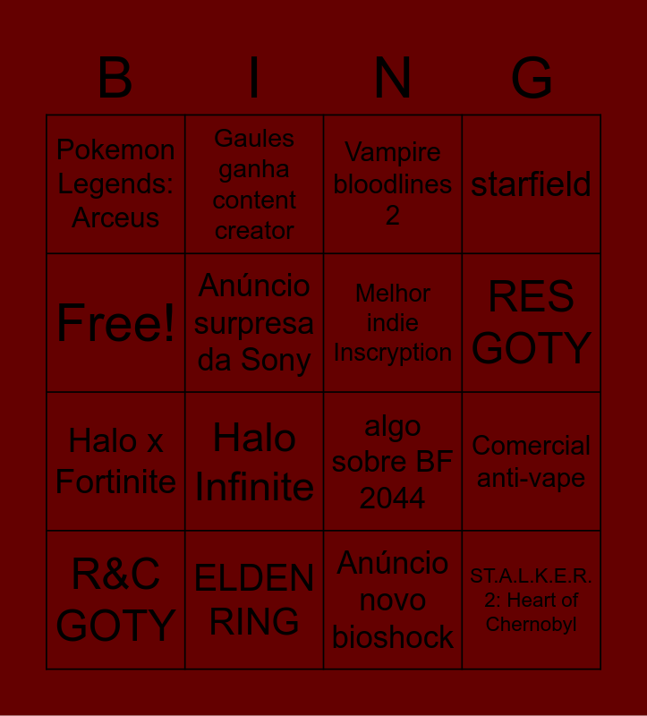 This bingo card has 16 words: ELDEN RING, Comercial anti-vape, Vampire bloodlines 2, Pokemon Legends: Arceus, Halo x Fortinite, Gaules ganha content creator, algo sobre BF 2044, Anúncio novo bioshock, Free!, Anúncio surpresa da Sony, R&C GOTY, starfield, Halo Infinite, RES GOTY, Melhor indie Inscryption and ST.A.L.K.E.R. 2: Heart of Chernobyl.