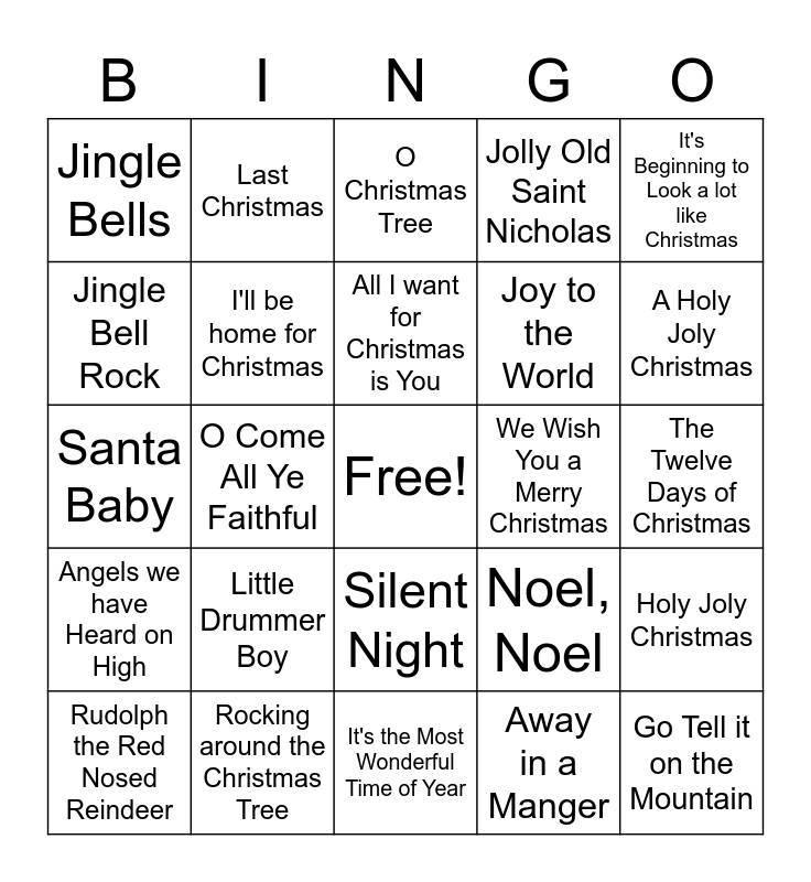 This bingo card has a free space and 25 words: Little Drummer Boy, It's the Most Wonderful Time of Year, All I want for Christmas is You, Rudolph the Red Nosed Reindeer, It's Beginning to Look a lot like Christmas, Jingle Bells, Jingle Bell Rock, Last Christmas, We Wish You a Merry Christmas, Silent Night, Joy to the World, Santa Baby, Noel, Noel, Holy Joly Christmas, I'll be home for Christmas, Let it Snow, The Twelve Days of Christmas, O Christmas Tree, A Holy Joly Christmas, O Come All Ye Faithful, Go Tell it on the Mountain, Rocking around the Christmas Tree, Angels we have Heard on High, Jolly Old Saint Nicholas and Away in a Manger.