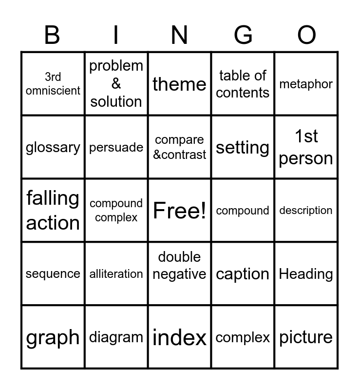This bingo card has a free space and 24 words: alliteration, diagram, compare &contrast, graph, metaphor, 3rd omniscient, glossary, problem & solution, compound, double negative, setting, falling action, caption, Heading, persuade, complex, description, theme, 1st person, compound complex, picture, sequence, table of contents and index.