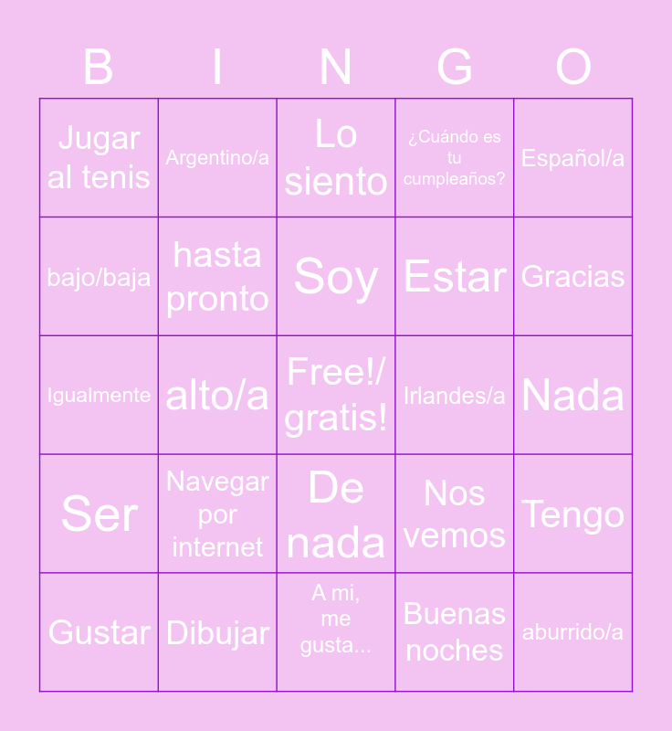 This bingo card has a free space and 24 words: Gustar, Navegar por internet, Soy, Buenas noches, Español/a, Jugar al tenis, Argentino/a, Lo siento, Irlandes/a, Nada, Igualmente, hasta pronto, Nos vemos, Tengo, bajo/baja, Dibujar, A mi, me gusta..., ¿Cuándo es tu cumpleaños?, Gracias, Ser, alto/a, De nada, Estar and aburrido/a.