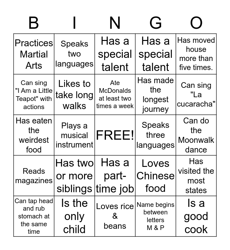 This bingo card has a free space and 24 words: Has two or more siblings, Is the only child, Ate McDonalds at least two times a week, Can tap head and rub stomach at the same time, Has moved house more than five times., Practices Martial Arts, Can sing "I Am a Little Teapot" with actions, Speaks two languages, Speaks three languages, Has a part-time job, Has made the longest journey, Has eaten the weirdest food, Loves Chinese food, Has visited the most states, Likes to take long walks, Name begins between letters M & P, Can do the Moonwalk dance, Has a special talent, Can sing "La cucaracha", Plays a musical instrument, Is a good cook, Reads magazines, Has a special talent and Loves rice & beans.