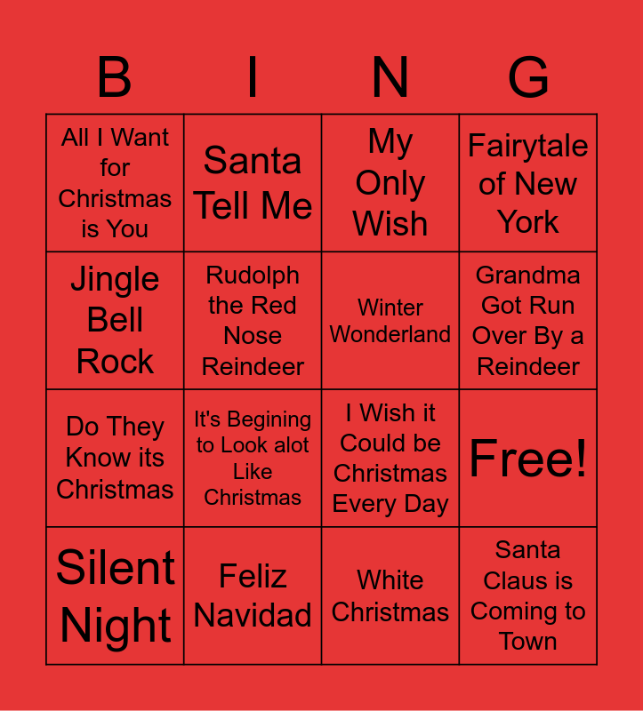 This bingo card has 20 words: Free!, Last Christmas, My Only Wish, Santa Baby, Silent Night, Jingle Bell Rock, Feliz Navidad, All I Want for Christmas is You, Do They Know its Christmas, Santa Tell Me, It's Begining to Look alot Like Christmas, I Wish it Could be Christmas Every Day, Rudolph the Red Nose Reindeer, Santa Claus is Coming to Town, Winter Wonderland, Step Into Christmas, Grandma Got Run Over By a Reindeer, Fairytale of New York, White Christmas and Rocking Around the Christmas Tree.