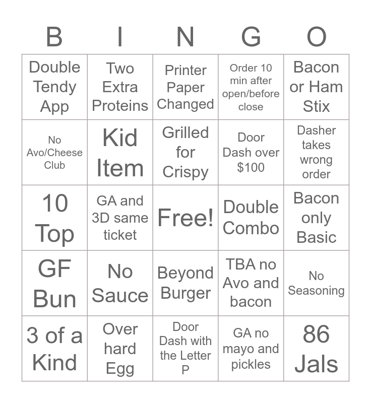 This bingo card has a free space and 24 words: No Sauce, Over hard Egg, Grilled for Crispy, 3 of a Kind, Bacon or Ham Stix, Double Tendy App, No Avo/Cheese Club, Two Extra Proteins, Double Combo, Beyond Burger, Door Dash over $100, 10 Top, TBA no Avo and bacon, No Seasoning, Kid Item, GA no mayo and pickles, Bacon only Basic, Printer Paper Changed, Dasher takes wrong order, GA and 3D same ticket, 86 Jals, GF Bun, Order 10 min after open/before close and Door Dash with the Letter P.