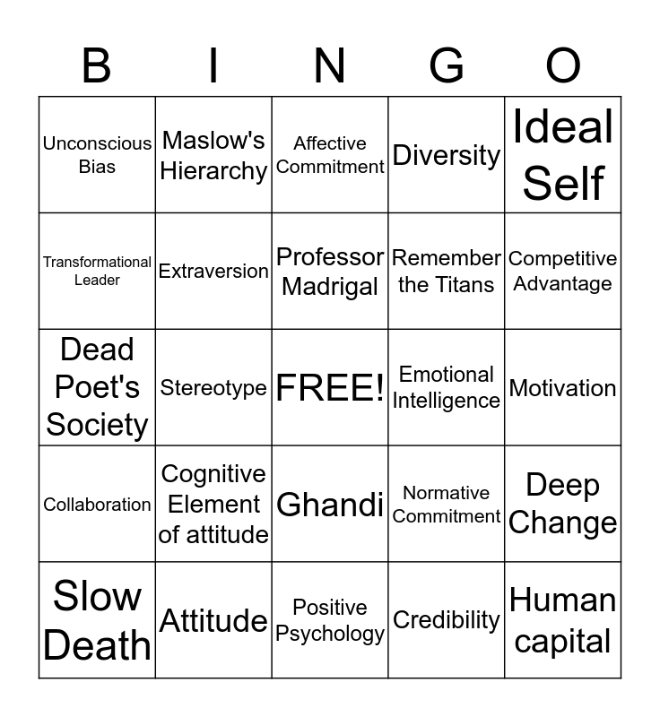 This bingo card has a free space and 24 words: Cognitive Element of attitude, Attitude, Professor Madrigal, Slow Death, Ideal Self, Unconscious Bias, Transformational Leader, Maslow's Hierarchy, Emotional Intelligence, Ghandi, Remember the Titans, Dead Poet's Society, Normative Commitment, Deep Change, Extraversion, Credibility, Motivation, Affective Commitment, Competitive Advantage, Stereotype, Human capital, Collaboration, Diversity and Positive Psychology.