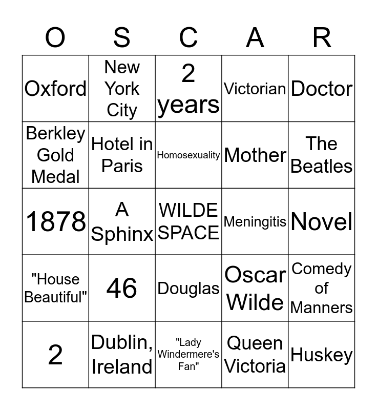 This bingo card has a free space and 24 words: 46, Dublin, Ireland, Homosexuality, 2, Doctor, Oxford, Berkley Gold Medal, New York City, Meningitis, Douglas, Mother, 1878, Oscar Wilde, Comedy of Manners, Hotel in Paris, Queen Victoria, Novel, 2 years, The Beatles, A Sphinx, Huskey, "House Beautiful", Victorian and "Lady Windermere's Fan".