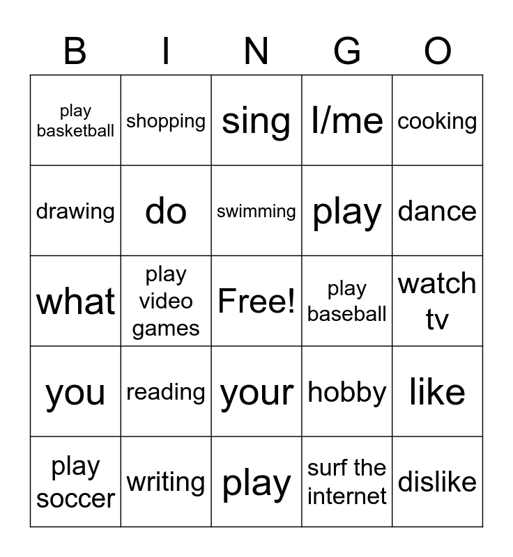 This bingo card has a free space and 24 words: reading, writing, swimming, play soccer, cooking, play basketball, drawing, shopping, play baseball, your, play, what, hobby, like, do, surf the internet, watch tv, sing, dance, play video games, dislike, you, I/me and play.