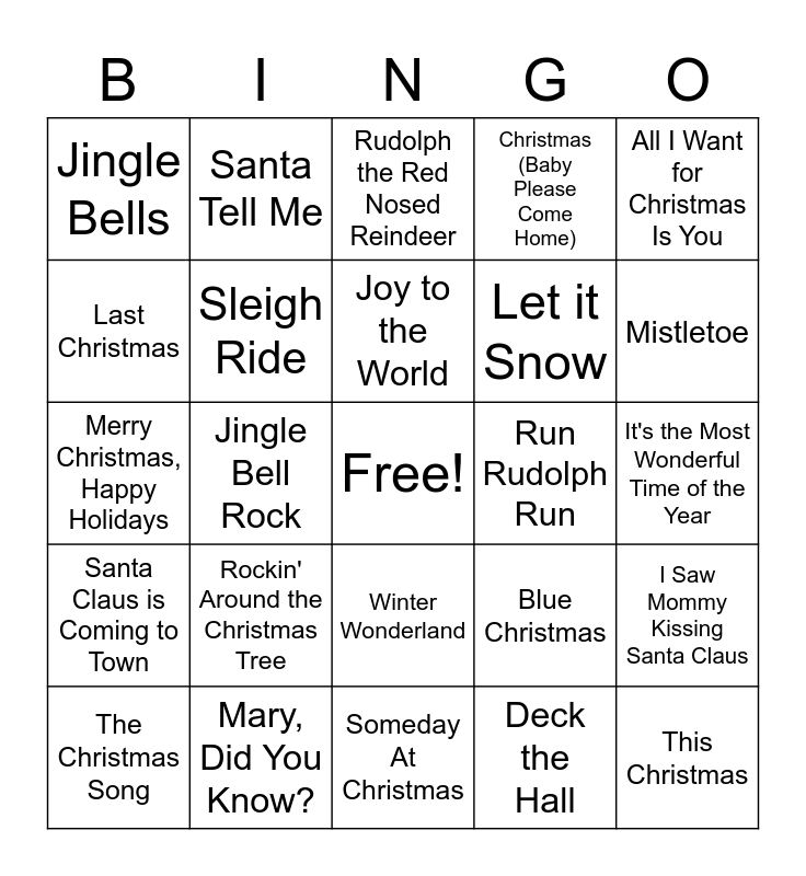 This bingo card has a free space and 30 words: Mary, Did You Know?, Where Are You Christmas, Jingle Bell Rock, Baby It's Cold Outside, Jingle Bells, Rudolph the Red Nosed Reindeer, Sleigh Ride, Winter Wonderland, Run Rudolph Run, Someday At Christmas, It's the Most Wonderful Time of the Year, This Christmas, Deck the Hall, Feliz Navidad, Mistletoe, Hallelujah, Blue Christmas, Santa Claus is Coming to Town, Rockin' Around the Christmas Tree, All I Want for Christmas Is You, Merry Christmas, Happy Holidays, Carol of the Bells, Santa Tell Me, Let it Snow, Last Christmas, Christmas (Baby Please Come Home), I Saw Mommy Kissing Santa Claus, The Christmas Song, Joy to the World and Winter Wonderland.