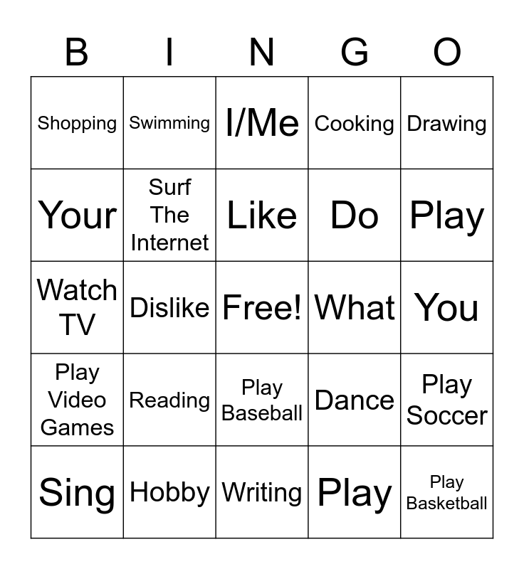 This bingo card has a free space and 24 words: Reading, Hobby, Like, Sing, Drawing, Shopping, Your, Swimming, What, Play Baseball, Do, Watch TV, Dance, Play Soccer, Surf The Internet, Play, You, I/Me, Play, Dislike, Play Basketball, Play Video Games, Cooking and Writing.