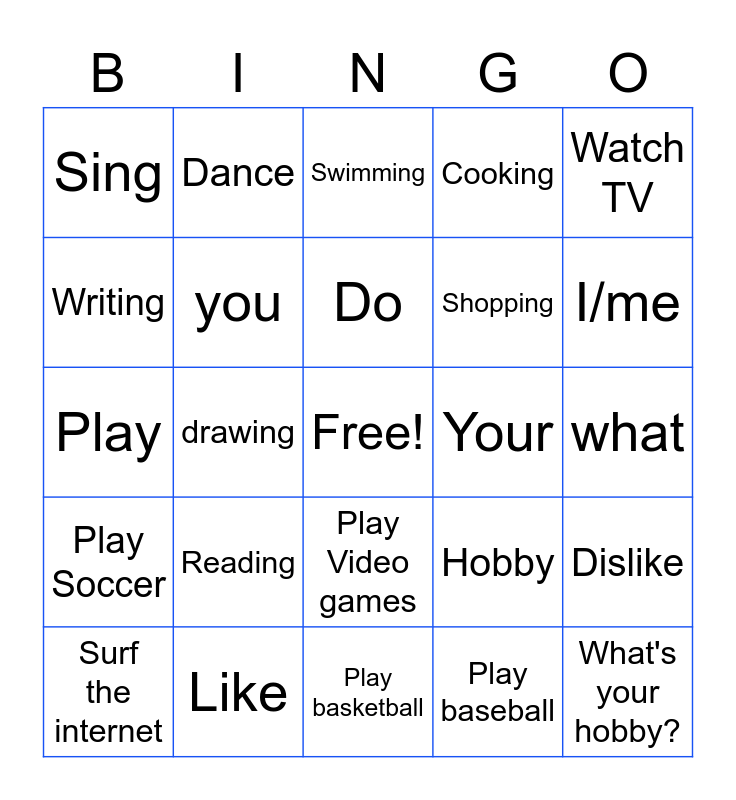This bingo card has a free space and 24 words: Reading, Like, Do, Surf the internet, Watch TV, Sing, Writing, Dance, Your, Play Video games, Shopping, Play, Hobby, Dislike, you, Play baseball, what, Swimming, I/me, drawing, What's your hobby?, Play Soccer, Cooking and Play basketball.