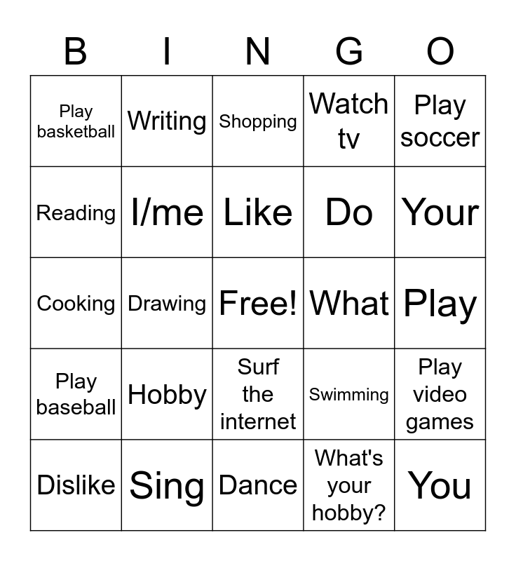 This bingo card has a free space and 24 words: Hobby, Sing, Like, Dislike, Play soccer, Play basketball, Reading, Writing, What, Surf the internet, Do, Cooking, Swimming, Play video games, I/me, What's your hobby?, Play, Shopping, Your, Drawing, You, Play baseball, Watch tv and Dance.
