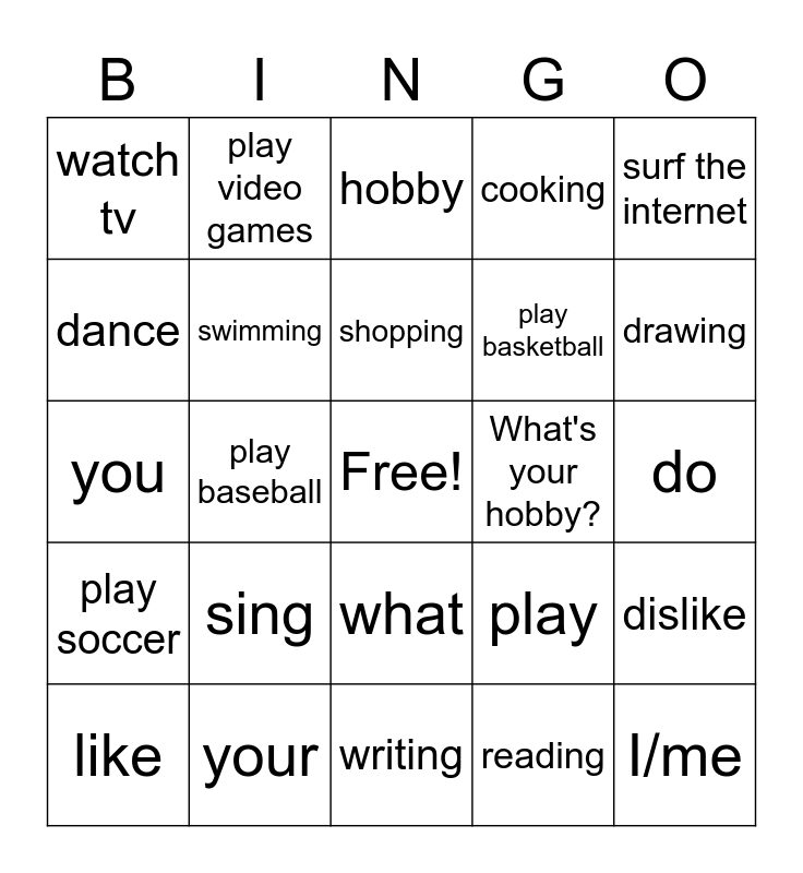 This bingo card has a free space and 24 words: sing, your, shopping, like, surf the internet, watch tv, dance, play video games, What's your hobby?, what, play basketball, you, play, dislike, swimming, reading, do, hobby, drawing, play baseball, I/me, play soccer, cooking and writing.