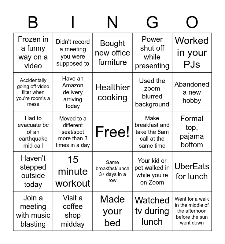This bingo card has a free space and 42 words: Walks around the block, Healthier cooking, More online shopping, 15 minute workout, Watched tv during lunch, UberEats for lunch, Went for a walk in the middle of the afternoon before the sun went down, Went to the office!!, Bought new office furniture, Same breakfast/lunch 3+ days in a row, Formal top, pajama bottom, Abandoned a new hobby, Moved to a different seat/spot more than 3 times in a day, Worked in your PJs, Worked from the deck/balcony/backyard, Your kid or pet walked in while you're on Zoom, Internet died mid meeting, Had to evacuate bc of an earthquake mid call, Turned off video cuz you're having a bad hair day, Didn't record a meeting you were supposed to, Accidentally going off video filter when you're room's a mess, Zoomed from the car, Been on mute when you're not supposed to be, Frozen in a funny way on a video, Made a custom slack emoji, Accidentally presented the wrong screen, Used the zoom blurred background, Had a pet crash the zoom, "Internet Connection Unstable" and worried the whole meeting that you were frozen, Ordered food delivery, Wearing athletic shorts, Haven't stepped outside today, Have an Amazon delivery arriving today, Made your bed, Have Alexa/Google speak during a meeting, Join a meeting with music blasting, Visit a coffee shop midday, Make breakfast and take the 8am call at the same time, Work from parent's house, Doorbell delivery during a meeting, Power shut off while presenting and Cleaned the house/apartment during lunch.