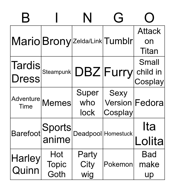 This bingo card has a free space and 24 words: Sports anime, Hot Topic Goth, DBZ, Harley Quinn, Attack on Titan, Mario, Tardis Dress, Brony, Sexy Version Cosplay, Deadpool, Furry, Adventure Time, Homestuck, Ita Lolita, Steampunk, Pokemon, Fedora, Zelda/Link, Small child in Cosplay, Memes, Bad make up, Barefoot, Tumblr and Party City wig.