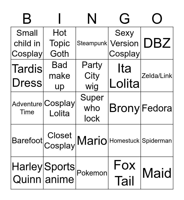 This bingo card has a free space and 24 words: Closet Cosplay, Sports anime, Party City wig, Harley Quinn, DBZ, Small child in Cosplay, Tardis Dress, Hot Topic Goth, Brony, Mario, Ita Lolita, Adventure Time, Homestuck, Spiderman, Bad make up, Fox Tail, Fedora, Steampunk, Zelda/Link, Cosplay Lolita, Maid, Barefoot, Sexy Version Cosplay and Pokemon.