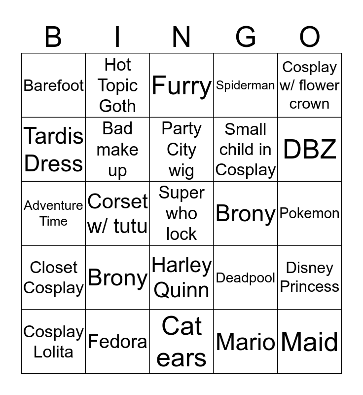 This bingo card has a free space and 24 words: Brony, Fedora, Party City wig, Cosplay Lolita, Cosplay w/ flower crown, Barefoot, Tardis Dress, Hot Topic Goth, Brony, Harley Quinn, Small child in Cosplay, Adventure Time, Deadpool, Disney Princess, Bad make up, Mario, Pokemon, Furry, DBZ, Corset w/ tutu, Maid, Closet Cosplay, Spiderman and Cat ears.