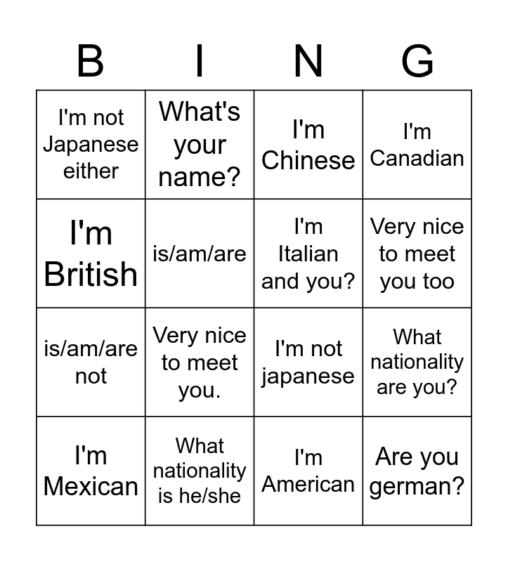 This bingo card has 16 words: What nationality is he/she, What nationality are you?, I'm Chinese, I'm not Japanese either, is/am/are not, What's your name?, I'm not japanese, I'm American, I'm British, is/am/are, I'm Mexican, I'm Canadian, Very nice to meet you., Very nice to meet you too, I'm Italian and you? and Are you german?.