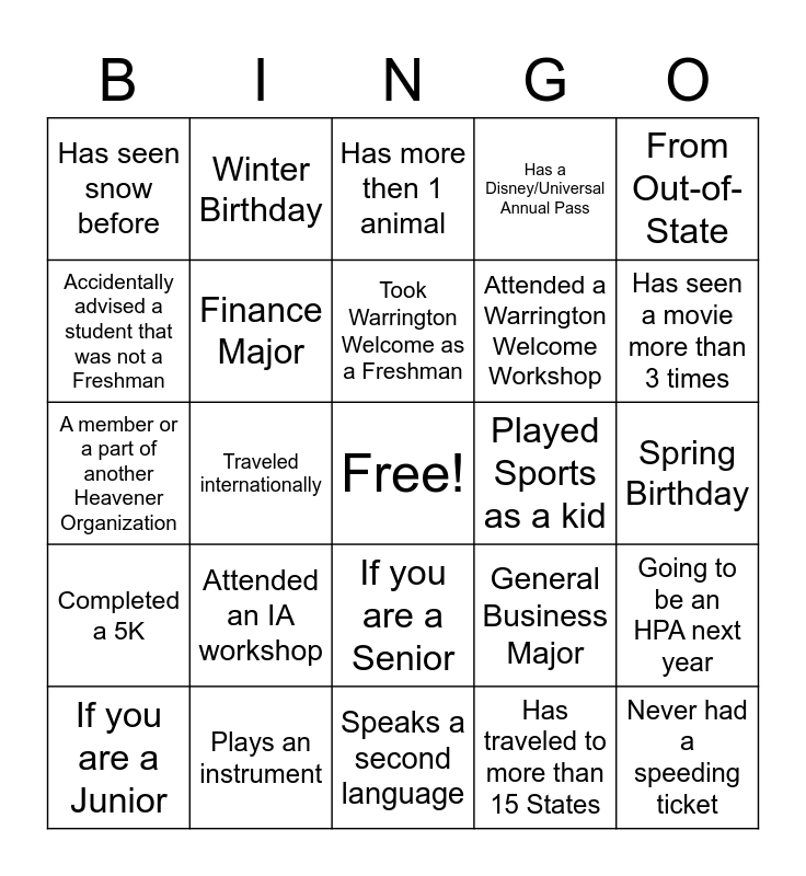 This bingo card has a free space and 24 words: Attended an IA workshop, Plays an instrument, Took Warrington Welcome as a Freshman, If you are a Junior, From Out-of-State, Has seen snow before, Accidentally advised a student that was not a Freshman, Winter Birthday, Played Sports as a kid, If you are a Senior, Attended a Warrington Welcome Workshop, A member or a part of another Heavener Organization, General Business Major, Going to be an HPA next year, Finance Major, Has traveled to more than 15 States, Spring Birthday, Has more then 1 animal, Has seen a movie more than 3 times, Traveled internationally, Never had a speeding ticket, Completed a 5K, Has a Disney/Universal Annual Pass and Speaks a second language.