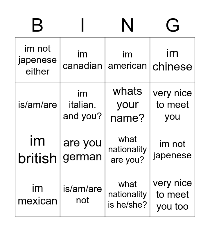 This bingo card has 16 words: is/am/are not, im not japenese, im american, im not japenese either, im british, im canadian, what nationality are you?, what nationality is he/she?, is/am/are, im italian. and you?, im mexican, im chinese, are you german, very nice to meet you, whats your name? and very nice to meet you too.
