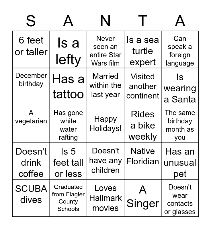 This bingo card has a free space and 34 words: An Artist, A Singer, Has twins, Jumped out of a plane, Doesn't drink coffee, Has a tattoo, Can speak a foreign language, SCUBA dives, Is a lefty, An only child, Married within the last year, Never seen an entire Star Wars film, Take Stock Mentor (or wants to be), Plays pickleball, Rides a bike weekly, Is wearing a Santa, Graduated from Flagler County Schools, A vegetarian, Is 5 feet tall or less, Native Floridian, Doesn't have any children, Has more than 4 pets, 6 feet or taller, The same birthday month as you, Loves Hallmark movies, Doesn't wear contacts or glasses, Is a sea turtle expert, Likes to collect things, Visited another continent, December birthday, Married more than 40 years, Has gone white water rafting, Has an unusual pet and Often confused as a student.
