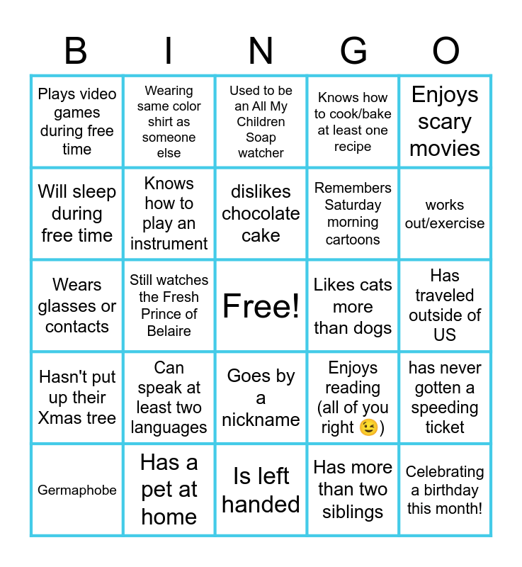 This bingo card has a free space and 44 words: Prefers pancakes over waffles, Can speak at least two languages, Has at least two social media accounts, Has more than two siblings, Woke up before 9am today, Has read at least three books this year, Knows how to play an instrument, Plays a sport, Knows how to cook/bake at least one recipe, Celebrating a birthday this month!, Plays video games during free time, Has a pet at home, Enjoys reading (all of you right 😉), Has traveled outside of US, Learned at least two tik tok dances over quarantine, Has/had braces, Is left handed, Likes cats more than dogs, Has never broken a bone before, Wears glasses or contacts, Wearing same color shirt as someone else, Goes by a nickname, Likes to draw or color, Enjoys scary movies, Has a snow blower, has went to a High School Reunion, dislikes chocolate cake, was born in same month as you, has never gotten a speeding ticket, Germaphobe, Has a son or daughter in school, Used to be an All My Children Soap watcher, Has an 80s playlist, Still listens TuPac, Hasn't put up their Xmas tree, Has put up their Xmas lights, Volunteered at a shelter, Has went to a concert, works out/exercise, Will sleep during free time, Still watches the Fresh Prince of Belaire, Has a favorite Disney Movie, Remembers Saturday morning cartoons and Loves holiday cookies.