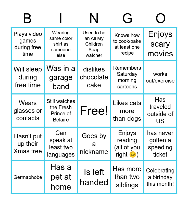 This bingo card has a free space and 44 words: Prefers pancakes over waffles, Can speak at least two languages, Has at least two social media accounts, Has more than two siblings, Woke up before 9am today, Has read at least three books this year, Was in a garage band, Plays a sport, Knows how to cook/bake at least one recipe, Celebrating a birthday this month!, Plays video games during free time, Has a pet at home, Enjoys reading (all of you right 😉), Has traveled outside of US, Learned at least two tik tok dances over quarantine, Has/had braces, Is left handed, Likes cats more than dogs, Has never broken a bone before, Wears glasses or contacts, Wearing same color shirt as someone else, Goes by a nickname, Likes to draw or color, Enjoys scary movies, Has a snow blower, has went to a High School Reunion, dislikes chocolate cake, was born in same month as you, has never gotten a speeding ticket, Germaphobe, Has a son or daughter in school, Used to be an All My Children Soap watcher, Has an 80s playlist, Still listens TuPac, Hasn't put up their Xmas tree, Has put up their Xmas lights, Volunteered at a shelter, Has went to a concert, works out/exercise, Will sleep during free time, Still watches the Fresh Prince of Belaire, Has a favorite Disney Movie, Remembers Saturday morning cartoons and Loves holiday cookies.