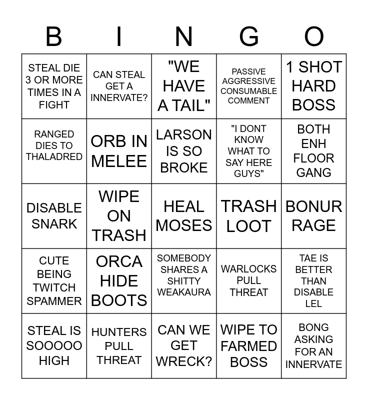 This bingo card has a free space and 24 words: STEAL IS SOOOOO HIGH, ORCA HIDE BOOTS, LARSON IS SO BROKE, WIPE TO FARMED BOSS, 1 SHOT HARD BOSS, STEAL DIE 3 OR MORE TIMES IN A FIGHT, CAN STEAL GET A INNERVATE?, "WE HAVE A TAIL", TRASH LOOT, BONUR RAGE, DISABLE SNARK, ORB IN MELEE, WARLOCKS PULL THREAT, TAE IS BETTER THAN DISABLE LEL, RANGED DIES TO THALADRED, HUNTERS PULL THREAT, CAN WE GET WRECK?, PASSIVE AGGRESSIVE CONSUMABLE COMMENT, BOTH ENH FLOOR GANG, CUTE BEING TWITCH SPAMMER, WIPE ON TRASH, SOMEBODY SHARES A SHITTY WEAKAURA, "I DONT KNOW WHAT TO SAY HERE GUYS" and BONG ASKING FOR AN INNERVATE.