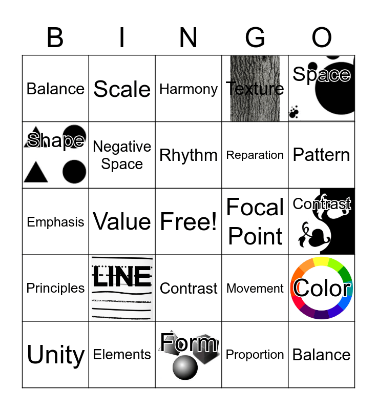 This bingo card has 7 images, a free space and 24 words: LINE, Elements, Rhythm, Unity, Space, Balance, Shape, Scale, Focal Point, Contrast, Reparation, Emphasis, Movement, Color, Negative Space, Proportion, Contrast, Harmony, Pattern, Value, Balance, Principles, Texture and Form.