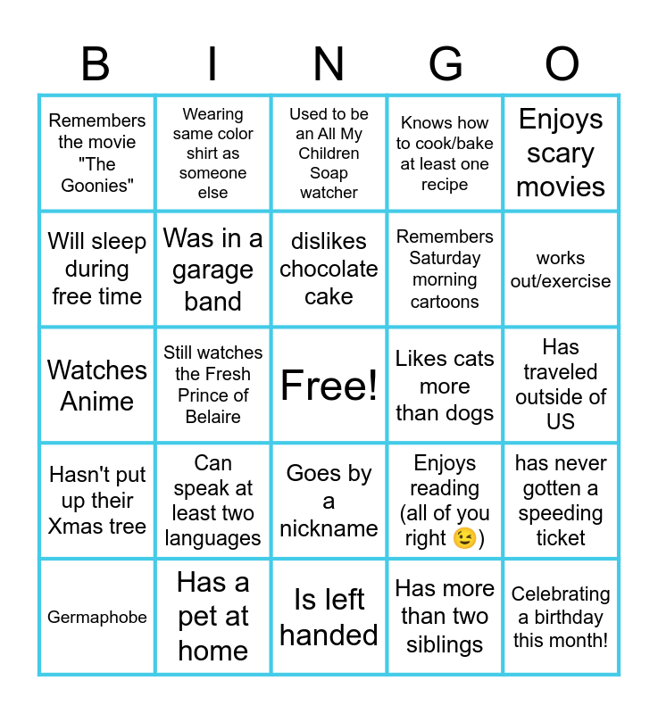 This bingo card has a free space and 44 words: Prefers cupcakes over brownies, Can speak at least two languages, Has at least two social media accounts, Has more than two siblings, Your children are your alarm clocks, Has read at least three books this year, Was in a garage band, Plays a sport, Knows how to cook/bake at least one recipe, Celebrating a birthday this month!, Remembers the movie "The Goonies", Has a pet at home, Enjoys reading (all of you right 😉), Has traveled outside of US, Learned at least two tik tok dances over quarantine, Has/had braces, Is left handed, Likes cats more than dogs, Has never broken a bone before, Watches Anime, Wearing same color shirt as someone else, Goes by a nickname, Likes to draw or color, Enjoys scary movies, Has a snow blower, has went to a High School Reunion, dislikes chocolate cake, was born in same month as you, has never gotten a speeding ticket, Germaphobe, Has a son or daughter in school, Used to be an All My Children Soap watcher, Has an 80s playlist, Still listens TuPac, Hasn't put up their Xmas tree, Has put up their Xmas lights, Volunteered at a shelter, Has went to a concert, works out/exercise, Will sleep during free time, Still watches the Fresh Prince of Belaire, Has a favorite Disney Movie, Remembers Saturday morning cartoons and Loves holiday cookies.
