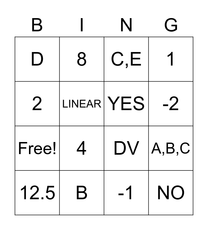 This bingo card has 20 words: A,B,C, 3, C,E, A, 12.5, 2, B, D, Free!, 8, 4, DV, LINEAR, NO, YES, QUADRATIC, -2, 1, -1 and 12.