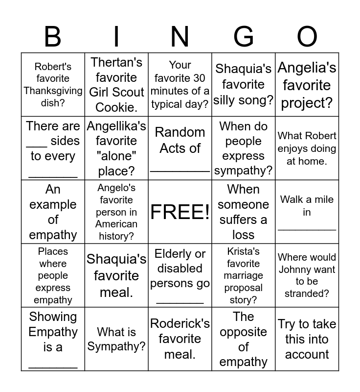 This bingo card has a free space and 35 words: What is Empathy?, Pat's favorite product?, Offering help to others who are ________, Angellika's favorite "alone" place?, Elderly or disabled persons go _______, Shaquia's favorite silly song?, There are ___ sides to every _______, Name your favorite TV character., Random Acts of ________, Rod's favorite way to spend $100?, An example of empathy, Angelia's favorite project?, Understanding how other people ______, Always try to understand this, Robert's favorite Thanksgiving dish?, When someone suffers a loss, The opposite of empathy, Angelo's favorite person in American history?, Places where people express empathy, Try to take this into account, Krista's favorite marriage proposal story?, Showing Empathy is a _______, Where would Johnny want to be stranded?, What is Sympathy?, Your favorite 30 minutes of a typical day?, What Robert enjoys doing at home., What Rod likes to do when he gets home., Expressing support when others are in ________, When do people express sympathy?, Walk a mile in __________, Relationships require this., Roderick's favorite meal., Shaquia's favorite meal., Thertan's favorite Girl Scout Cookie. and Joe's favorite thing to walk on in bare feet..
