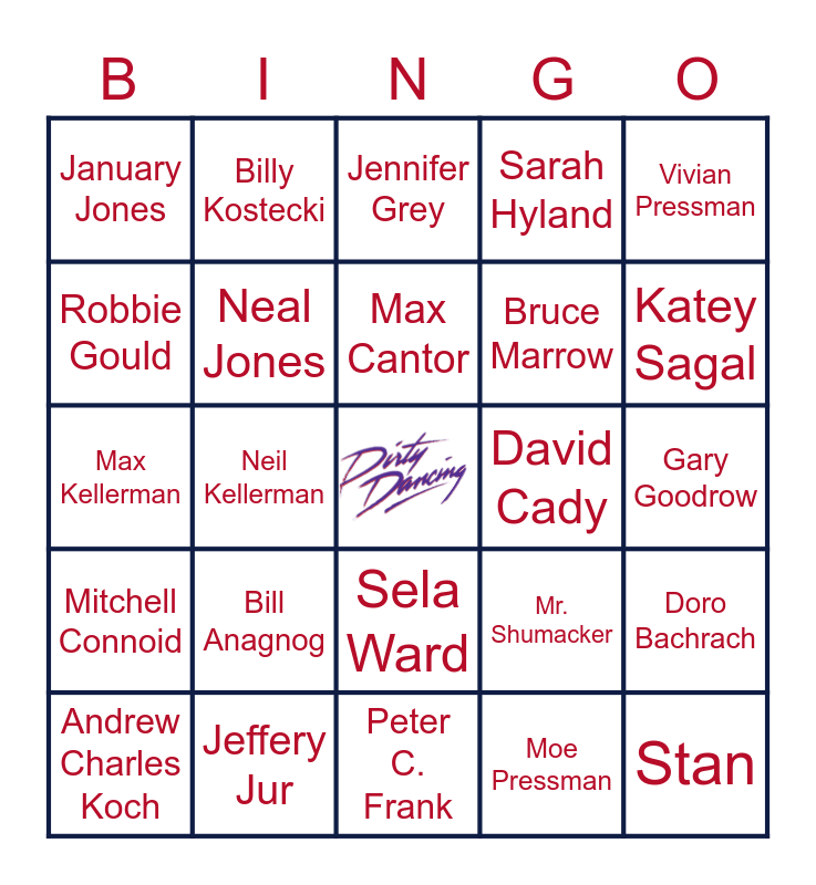 This bingo card has a free space and 75 words: Patrick Swayze, Johnny Castle, Jennifer Grey, Frances "Baby" Houseman, Cynthia Rhodes, Penny Johnson, Kelly Bishop, Malorie Houseman, Jerry OrBach, Dr. Jake Houseman, Jane Brucker, Lisa Houseman, Max Cantor, Robbie Gould, Lonny Price, Neil Kellerman, Wayne Knight, Stan, Miranda Garrison, Vivian Pressman, Jack Weston, Max Kellerman, Neal Jones, Billy Kostecki, Sarah Hyland, D.A. Pauley, Eleanor Bergstein, Jennifer Stahl, Charles Coles, Tito Sanchez, Paula Trueman, Mrs. Shumacker, Alvin Myerovich, Mr. Shumacker, Katey Sagal, Bruce Marrow, Linda Gottlieb, Darren W. conrad, Gary Goodrow, Moe Pressman, Antone Pagan, David Chapman, Heather LeaGerdes, Doriana Sanchez, Karen Getz, Diego Luna, Andrew Charles Koch, January Jones, Kenny Ortega, Jose Luis Gil, Romola Garai, Sela Ward, Jesus Fuentes, John Slattery, Jonathan Jackson, Tom Drake, Nathalie Vadim, Clay A. Griffith, Steven Reuther, Bonnie Tillman, Bill Anagnog, Rick Dior, Scott Zigler, John Pritchett, Herb Gains, David Cady, Ted Churchill, Emile Ardolino, Elaine Bernstein, Doro Bachrach, Mitchell Connoid, Jeffery Jur, John Morris, Peter C. Frank and Betty Timmerman ancing.