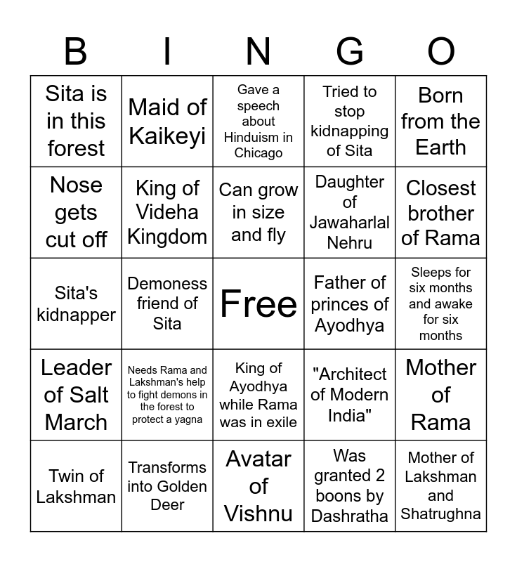 This bingo card has a free space and 24 words: Needs Rama and Lakshman's help to fight demons in the forest to protect a yagna, Transforms into Golden Deer, Can grow in size and fly, Twin of Lakshman, Born from the Earth, Sita is in this forest, Nose gets cut off, Maid of Kaikeyi, Father of princes of Ayodhya, King of Ayodhya while Rama was in exile, Daughter of Jawaharlal Nehru, Sita's kidnapper, "Architect of Modern India", Mother of Rama, King of Videha Kingdom, Was granted 2 boons by Dashratha, Sleeps for six months and awake for six months, Gave a speech about Hinduism in Chicago, Closest brother of Rama, Demoness friend of Sita, Mother of Lakshman and Shatrughna, Leader of Salt March, Tried to stop kidnapping of Sita and Avatar of Vishnu.
