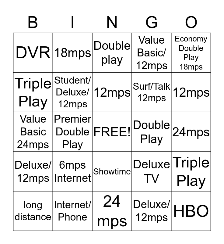 This bingo card has a free space and 24 words: 6mps Internet, Internet/ Phone, 12mps, long distance, Economy Double Play 18mps, DVR, Triple Play, 18mps, Double Play, Showtime, Surf/Talk 12mps, Value Basic 24mps, Deluxe TV, Triple Play, Student/ Deluxe/ 12mps, Deluxe/ 12mps, 24mps, Double play, 12mps, Premier Double Play, HBO, Deluxe/ 12mps, Value Basic/ 12mps and 24 mps.