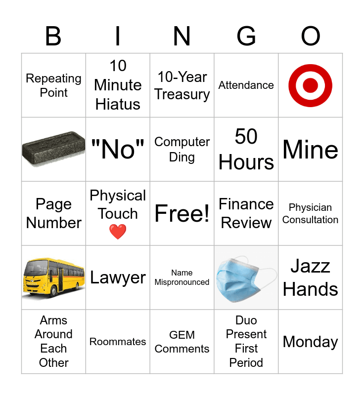 This bingo card has 4 images, a free space and 20 words: Lawyer, Roommates, Computer Ding, Arms Around Each Other, Repeating Point, 10 Minute Hiatus, Finance Review, Name Mispronounced, 50 Hours, Page Number, Jazz Hands, "No", Duo Present First Period, Physician Consultation, 10-Year Treasury, Mine, Physical Touch ❤️, Monday, Attendance and GEM Comments.