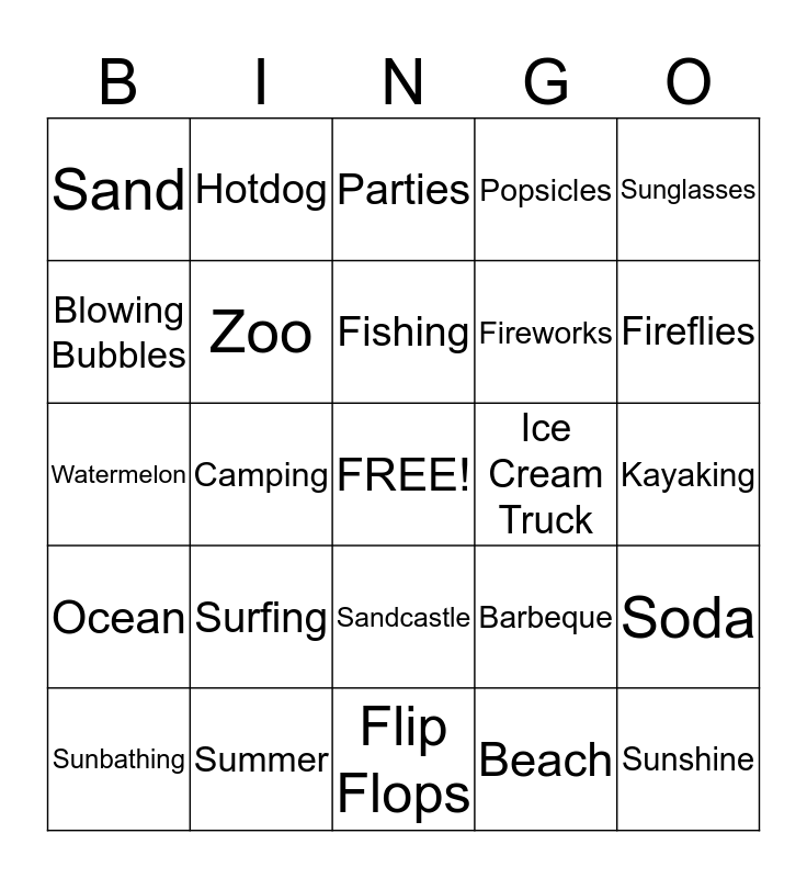 This bingo card has a free space and 24 words: Surfing, Summer, Fishing, Sunbathing, Sunglasses, Sand, Blowing Bubbles, Hotdog, Ice Cream Truck, Sandcastle, Fireworks, Watermelon, Barbeque, Soda, Zoo, Beach, Kayaking, Parties, Fireflies, Camping, Sunshine, Ocean, Popsicles and Flip Flops.
