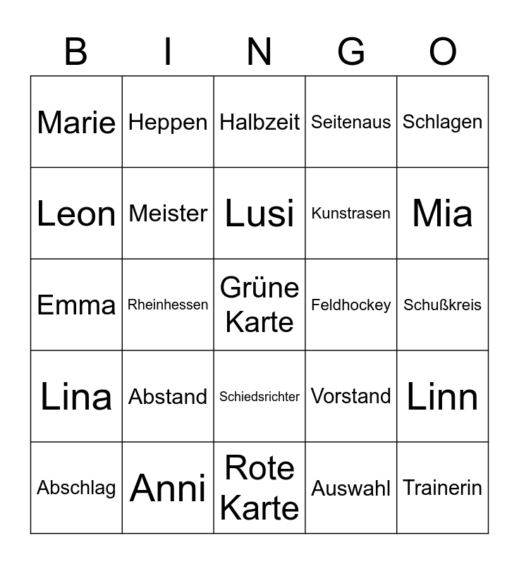 This bingo card has 71 words: Free!, Heppen, Anstoß, Deutscher Meister, Rote Karte, Irma, Seitenaus, Selbstpass, Kunstrasen, Mädchen C, Abschlag, Verloren, Mia, Marie, Oberliga, Emma, Vorstand, Schlagen, Weltmeister, Schußkreis, Abstand, Grüne Karte, Linn, Marleen K., Schlenzen, Hallenhockey, Toraus, Verein, Rückhand, Trainer, Anni, Hobby, Verbandsliga, Clara, Auswahl, Gewonnen, Ava, Hanna, Leon, Europameister, Schiedsrichter, Trainerin, Lina, Siebenmeter, Hockey-Tor, Gelbe Karte, Ricarda, Meister, Jil, Zuschauer, Gegner, Anuschka, Feldhockey, TVA, Training, Elin, Lusi, Strafecke, Lange Ecke, Käthe, Turnier, Penalty, Rheinhessen, Schruppen, Stockfoul, Vorhand, Halbzeit, Unentschieden, Pokal, Marleen D. and Jugendwart.