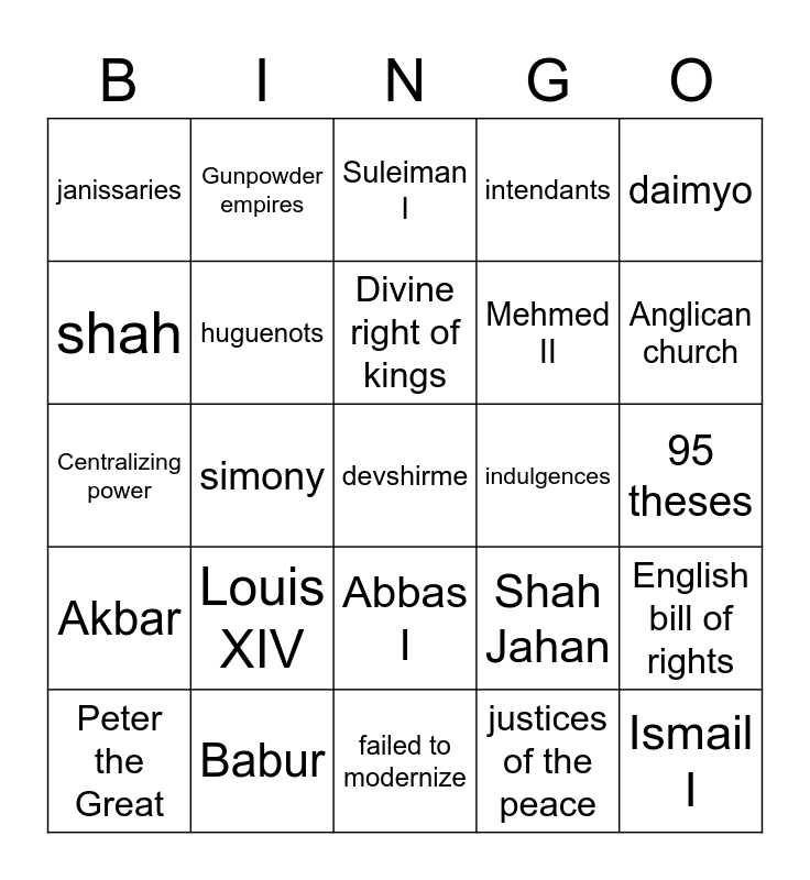 This bingo card has a free space and 24 words: Louis XIV, Babur, Divine right of kings, Peter the Great, daimyo, janissaries, shah, Gunpowder empires, indulgences, Abbas I, Mehmed II, Centralizing power, Shah Jahan, English bill of rights, huguenots, justices of the peace, 95 theses, Suleiman I, Anglican church, simony, Ismail I, Akbar, intendants and failed to modernize.