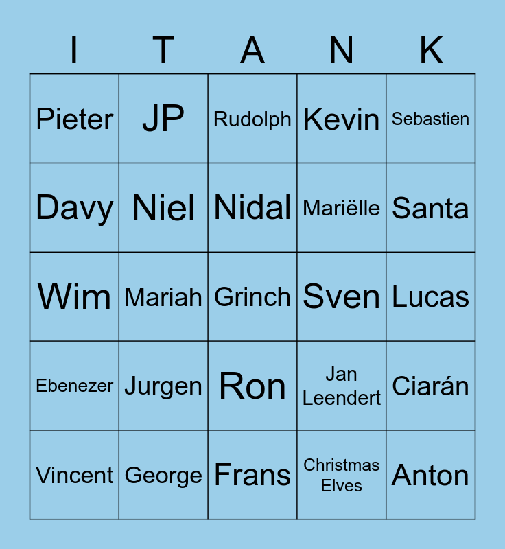 This bingo card has 25 words: Jurgen, Frans, Nidal, Vincent, Sebastien, Pieter, Davy, JP, Sven, Ron, Mariëlle, Wim, Jan Leendert, Ciarán, Niel, Anton, Lucas, Rudolph, Santa, Mariah, Grinch, George, Ebenezer, Kevin and Christmas Elves.