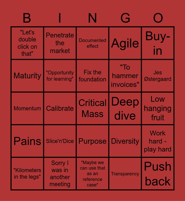 This bingo card has 57 words: "Journey", "Kilometers in the legs", "Let me just google that", "Let's double click on that", "Maybe we can use that as an reference case", "One shovelful deeper", "Opportunity for learning", "Sorry I was on mute", "To hammer invoices", #REF!, Agile, Best practice, Big-data, Bonus target, Burning platform, Business as usual - deliver different, Buy-in, Calibrate, Consultant body, Critical Mass, Deep dive, Deliverables, Diversity, Documented effect, Fast forward, Fix the foundation, Hours in the book, Impact that matters, Jes Østergaard, Kristian Salling, Jakob Ørskov, Søren Kabel4, Key take away, License to play, Low hanging fruit, Maturity, Maturity assessment, Momentum, One-pager, Pains, Penetrate the market, Purpose, Push back, Quick fix (Duct tape solution), Quick wins, Sales Meeting v17 w. comments2 final.pptx, Slice'n'Dice, Sorry I was in another meeting, Synergy, The bench, Toolbox, Transparency, Value proposition, Virtual Friday bar, War stories, Work hard - play hard and Work-Life Balance.