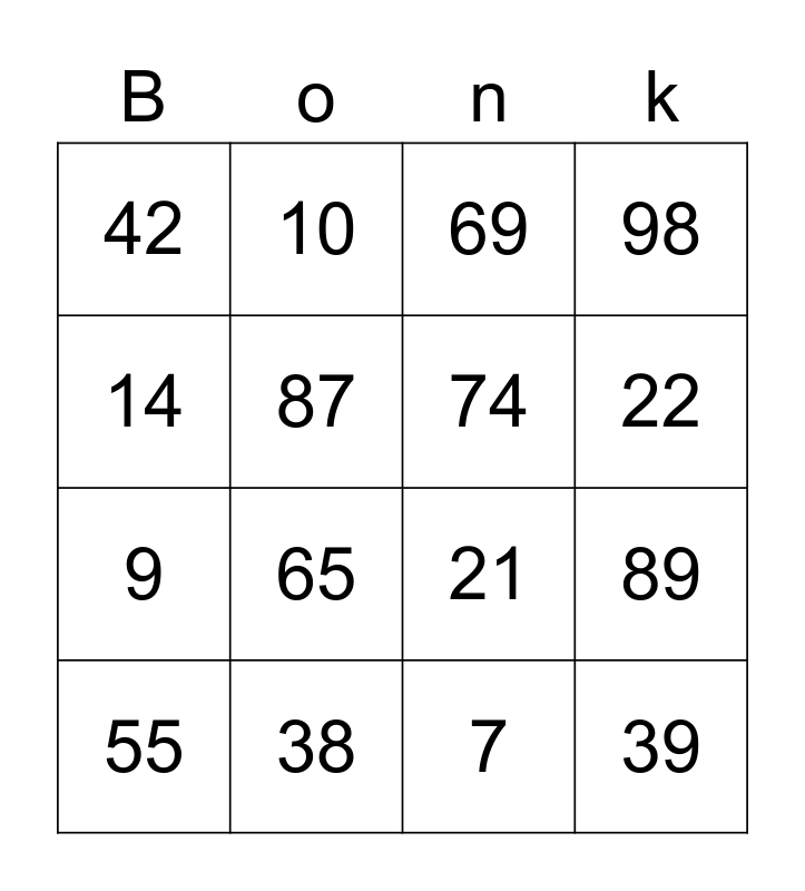 This bingo card has 16 words: 38, 89, 69, 42, 9, 10, 21, 7, 14, 87, 55, 98, 65, 22, 74 and 39.