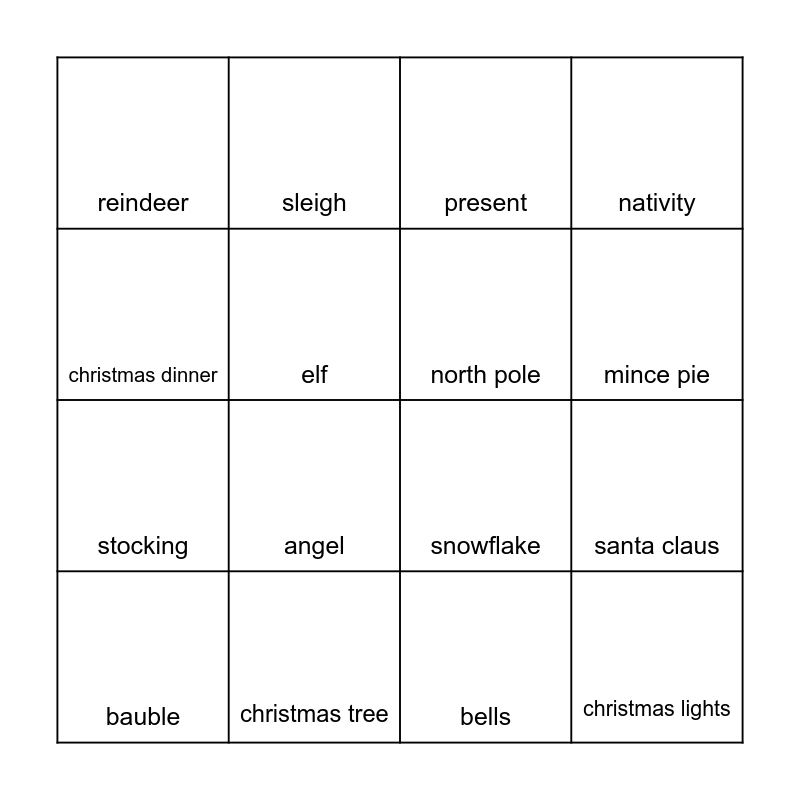 This bingo card has 16 words: christmas tree, santa claus, present, reindeer, stocking, sleigh, snowflake, bells, christmas dinner, elf, bauble, nativity, angel, mince pie, north pole and christmas lights.