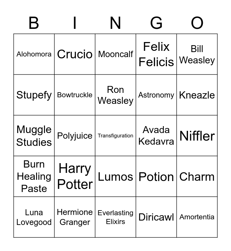 This bingo card has a free space and 24 words: Harry Potter, Hermione Granger, Ron Weasley, Luna Lovegood, Bill Weasley, Alohomora, Stupefy, Crucio, Avada Kedavra, Lumos, Astronomy, Muggle Studies, Potion, Charm, Bowtruckle, Diricawl, Niffler, Mooncalf, Kneazle, Polyjuice, Amortentia, Burn Healing Paste, Felix Felicis and Everlasting Elixirs.