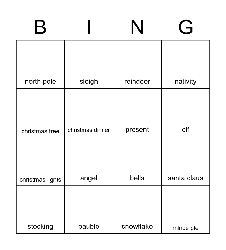 This bingo card has 16 words: bauble, santa claus, reindeer, north pole, christmas lights, sleigh, bells, snowflake, christmas tree, christmas dinner, stocking, nativity, angel, elf, present and mince pie.