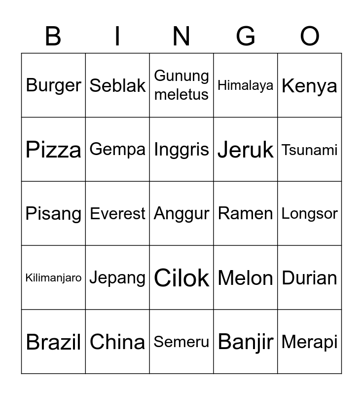 This bingo card has a free space and 24 words: Jepang, China, Inggris, Brazil, Kenya, Burger, Pizza, Seblak, Ramen, Cilok, Jeruk, Pisang, Melon, Durian, Gempa, Banjir, Longsor, Gunung meletus, Tsunami, Everest, Merapi, Kilimanjaro, Himalaya and Semeru.